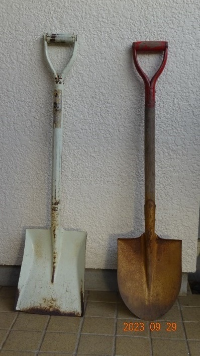 この定義に合うもののうちスコップ写真は残念ながら筆者の土木写真コレクションにはありませんでした。下の写真はショベルのうち角形(左)と丸形を示したものです(撮影2023年9月29日)。「コンクリート用」の形状は角型とほぼ同じですから省きます。