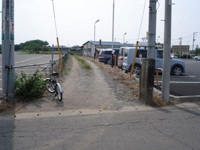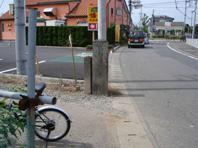 ここから、ふれあい道路と並行して舗装されていない小さな道があります(写真4。この方向が矢印の指している方向)。先の地図ではよく分かりませんが、これでも昭和初期当時は、道標のできるような主要道路であったのでしょう。