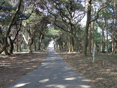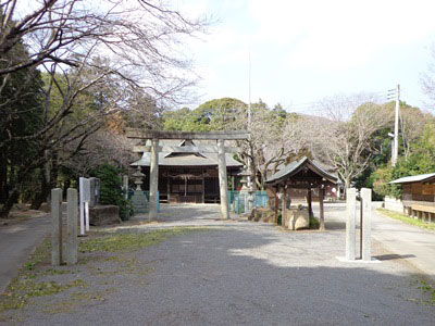 写真右側看板の赤い字は小さすぎてはっきりしませんが「やぶさめ祭」となっています。一の鳥居をくぐると、長い参道が続き、ここで流鏑馬が行われる(2013年今年は4月7日)のだそうです。流鏑馬についての長い説明板もありましたから、あとの方で引用してご紹介します。