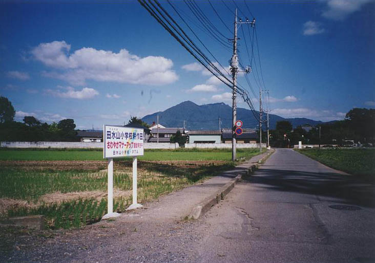 中央の白い建物の左に少し高い樹木がありますが、その向こう側が営所跡です。右側から多少急な坂をあがると右側に小学校があります。田水山(たみやま)小学校です。この小学校は明治10年に創立の古い学校ですが、そのときは先の田中にあり、田中小学校といったようです。その後田水山小学校となり、昭和48年現在地の水守620番地に移転しています。