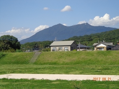 中に入ってみます。周囲を土塁に囲まれていますが,中は平坦で,建物跡なども埋め戻されています。一カ所だけ四阿(あずまや)ふうの休憩所があります(動画参照)。筑波山が近くにみえます。にもかかわらず平城としたのは,筑波山が神聖であったからなのかなと考えてしまいます。