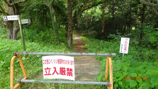 写真7 イノシシ出現,立ち入り禁止(2019年6月2日撮影) | 写真8 大宮神社(2019年6月2日撮影) |