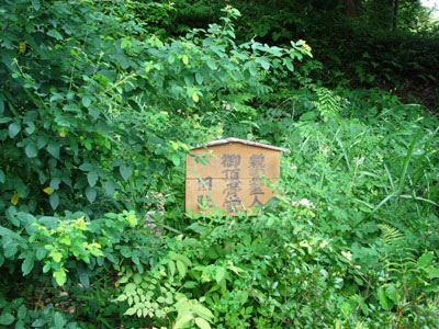 写真12が御頂骨堂です。説明によりますと、分骨された親鸞の遺骨が納められているのだそうです。ところが、写真10の右手草むらの中をのぞくと、写真13のような立て札がありました。【親鸞聖人御頂骨堂旧跡】とありますから、元はこの辺りにあって、いつのころか今の処に移されたようです。