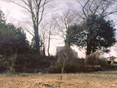 そのころの写真1の一番奥のあたり(茶色の建物は病院で、その先が戸頭団地1丁目の建物です)は、まだ開通していない山林で、写真2、3のような風景でした。写真が古い(撮影1981年)のでピントが甘いのですが、写真3の中央が戸頭団地1丁目の建物です。この当時は入居しておらず、「マムシ注意」の看板などがありました。写真3の左手の木の根元に石塔があります。それが写真4です。たしか、大日塚と言ったような記憶があります。