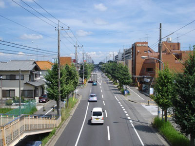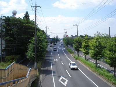 取手駅前から延びる「常総ふれあい道路」は、国道294号の実質上のバイパスとして戸頭団地の南を通っています。1987年(昭和62年)の開通で、写真1は、戸頭中学校のところにある横断歩道橋から取手方面を望んだものです。左手が戸頭中学校グランドです。写真右手に折れると旧戸頭村方面です。このあたりは、現在では戸頭1丁目となっています。写真2は、同じところから守谷方面を見たものです。