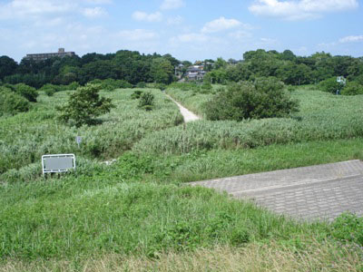 右へ下って利根川堤防まで行き、振り返ったのが写真14です。現在では利根川水面まではかなり遠いので、今回はここまでで引き返し、三差路を稲の方に向かいます。ちなみに現在このあたりは稲戸井調整池となっています。