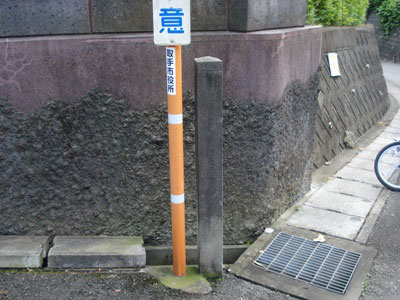 ここから利根川の方に向かっていくと戸頭神社です。前回はふれませんでしたが、神社入り口には写真11の道路元標(大正十四年建立銘)があります。また、以前は七里の渡しへ行く道であったろう坂の手前が三差路(写真12)になっており、カーブミラーの下に写真13のような道票があります。