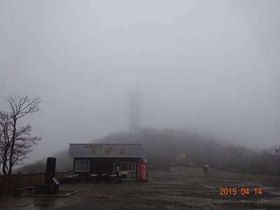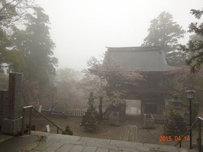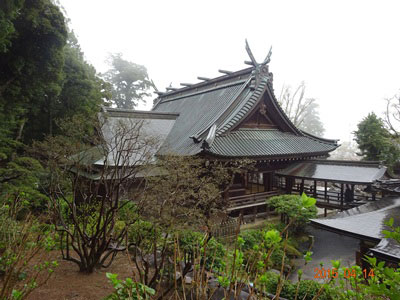 荘厳な拝殿の裏手に、写真7の朝日稲荷神社があります。数多くの摂社・末社のうちのひとつで「出世稲荷」と言われていますが、前掲書には記載がありません。さて、振り返ってみると写真8のように霧がでてきましたし雨も降ってきました。ここで引き返すのもなんだかもったいないので、もう少し進んでみます。